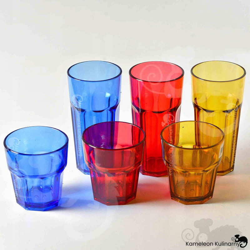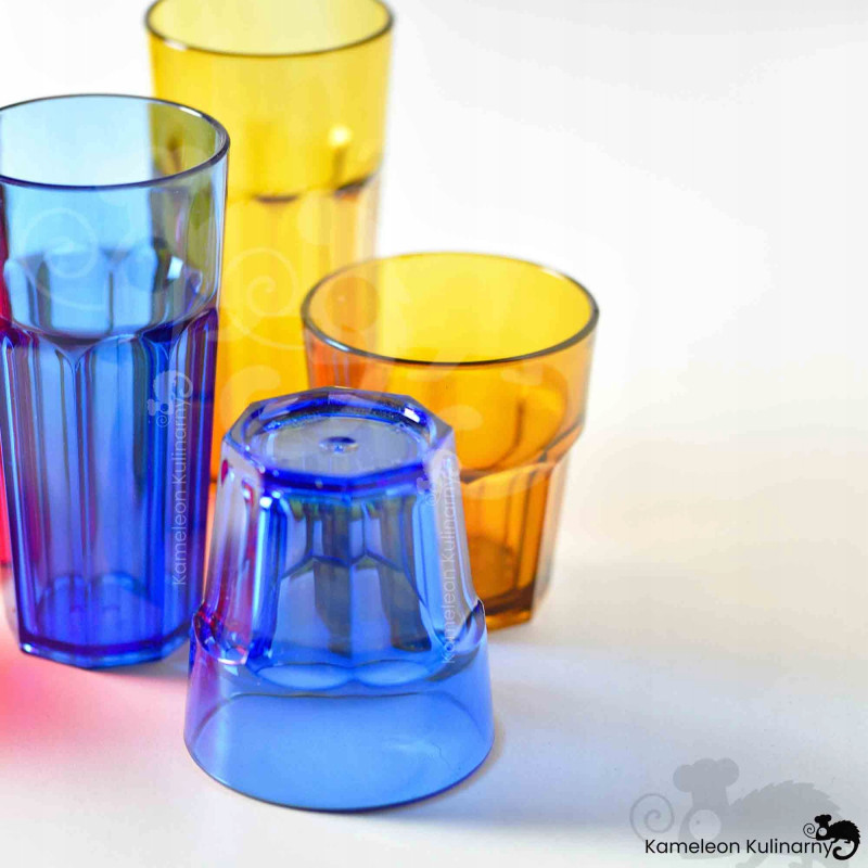 SERIA KOLOROWYCH SZKLANEK z poliwęglanu to nietłukące, super praktyczne SZKLANKI w 3 kolorach. Podczas słonecznego dnia czy też naczyń używanych w ogrodzie - możemy nadać stołowi dużo blasku, koloru, refleksów. Wprowadzają nie tylko kolor, ale dużo energii. Poza tym - są bezpieczne bo nietłukące. Można je dzięki temu wziąć do ogrodu, na grilla, do basenu bez obaw o uszkodzenie czy potłuczenie. Dostępne są w 2 wielkościach 250 i 360ml, w 3 kolorach: niebieski, czerwony i brąz (nazywany czasem złotym).
