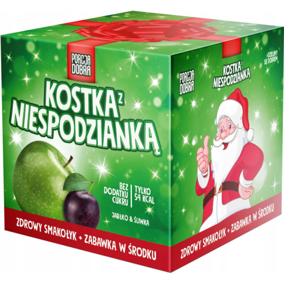 Zawiera zdrowy smakołyk, zabawkę niespodziankę oraz dobrokartę - z motywem Bożonarodzeniowym. Produkt zachęca dziecko do posmakowania zdrowego smakołyku poprzez całość doświadczenia odkrywania zawartości kostki. Jest to unikatowy produkt i jedyny zdrowy zamiennik Kinder Niespodzianki.