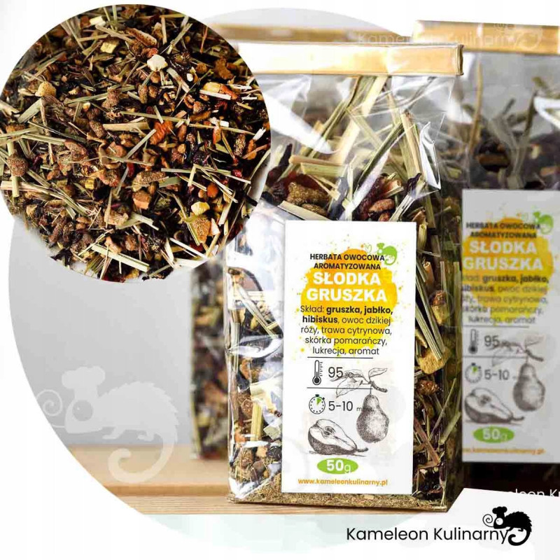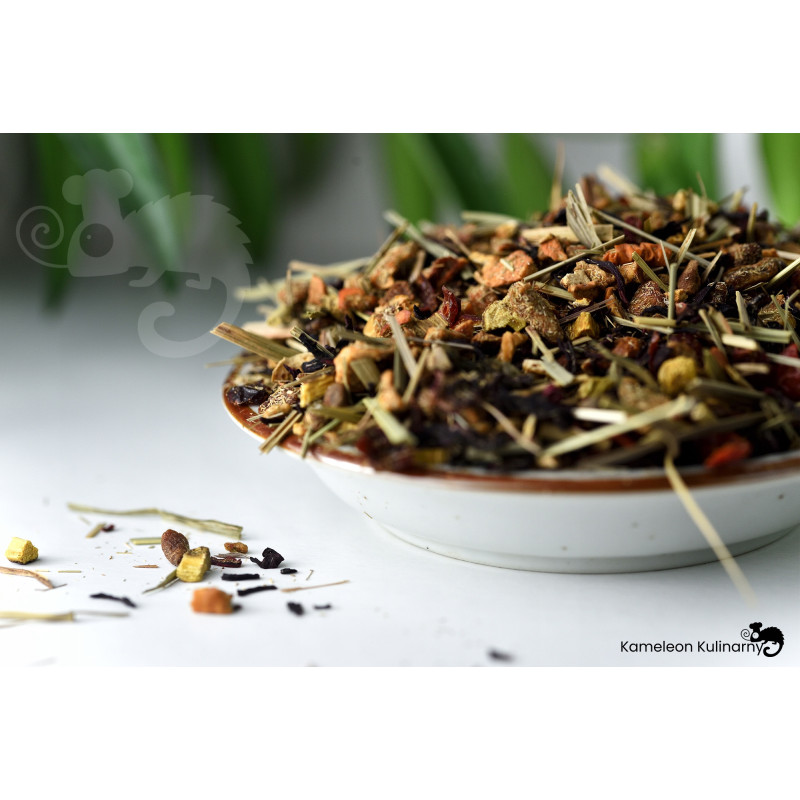 Skład: gruszka, jabłko, hibiskus, owoc dzikiej róży, trawa cytrynowa, skórka pomarańczy, lukrecja, aromat