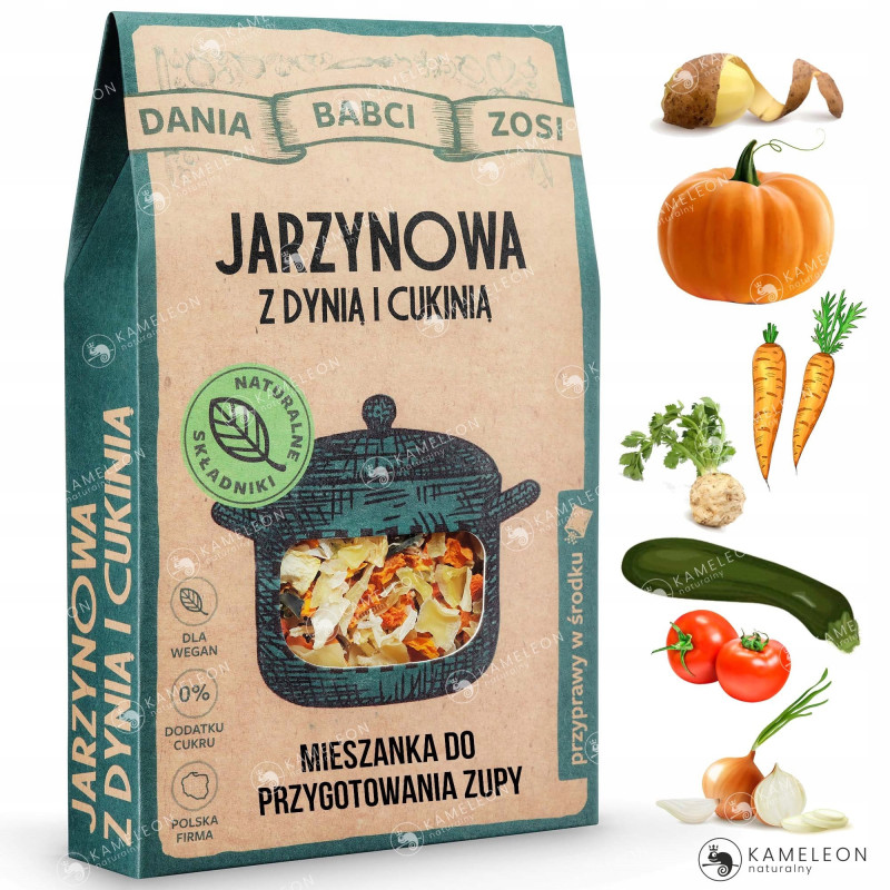 Lekka, warzywna zupa to prawdziwy klasyk. W wersji Babci Zosi. W składzie znajdziesz wyłącznie naturalne składniki: suszone warzywa i przyprawy, których w kuchni używa każda kochająca babcia. Zawartość opakowania wystarczy wsypać do wody i gotować przez 20 minut, aby móc cieszyć się smakiem tradycyjnej, domowej zupy jarzynowej.