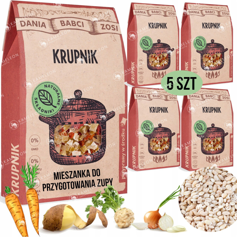 Tradycyjna polska zupa, do stworzenia której inspiracją były przepisy Babci Zosi. W składzie znajdziesz wyłącznie naturalne składniki: kaszę, suszone warzywa i przyprawy, których w kuchni używa każda kochająca babcia. Zawartość opakowania wystarczy wsypać do wody i gotować przez 20 minut, aby móc cieszyć się smakiem tradycyjnego, domowego krupniku.