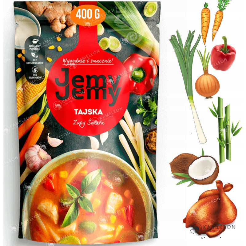 Masz ochotę na łyżkę Orientu? Ugotowaliśmy dla Ciebie zupę tajską – na mięsie z kurczaka, z bogactwem warzyw, trawą cytrynową, z wyczuwalną nutą kokosową. Dodaliśmy do niej aromatyczne przyprawy, pastę curry i sos rybny. Wystarczy podgrzać i można jeść!