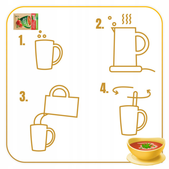 - Bardzo szybka i łatwa w przygotowaniu - wystarczy zalać wrzątkiem i wymieszać by cieszyć się ciepłym smacznym posiłkiem.